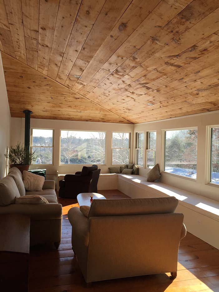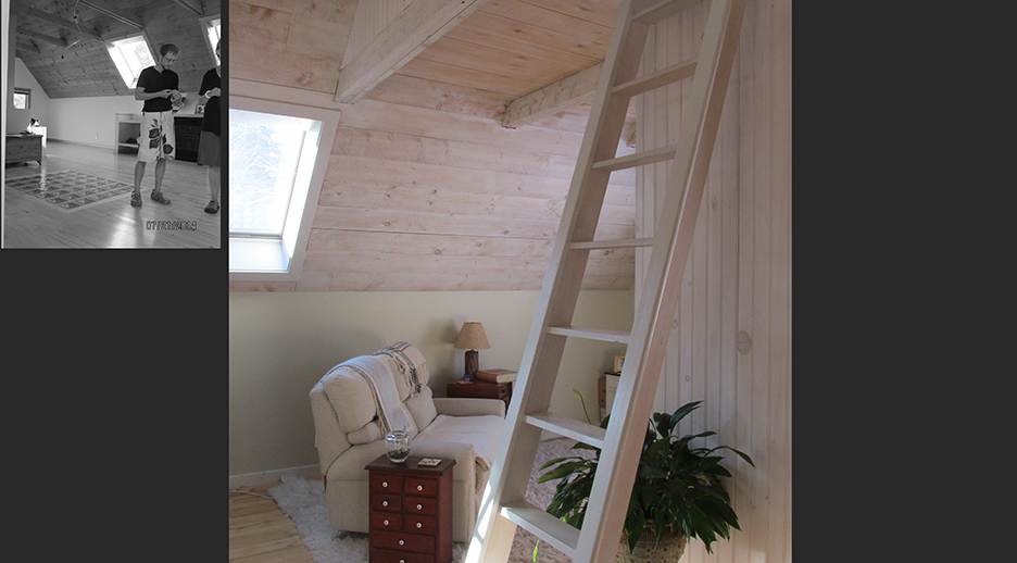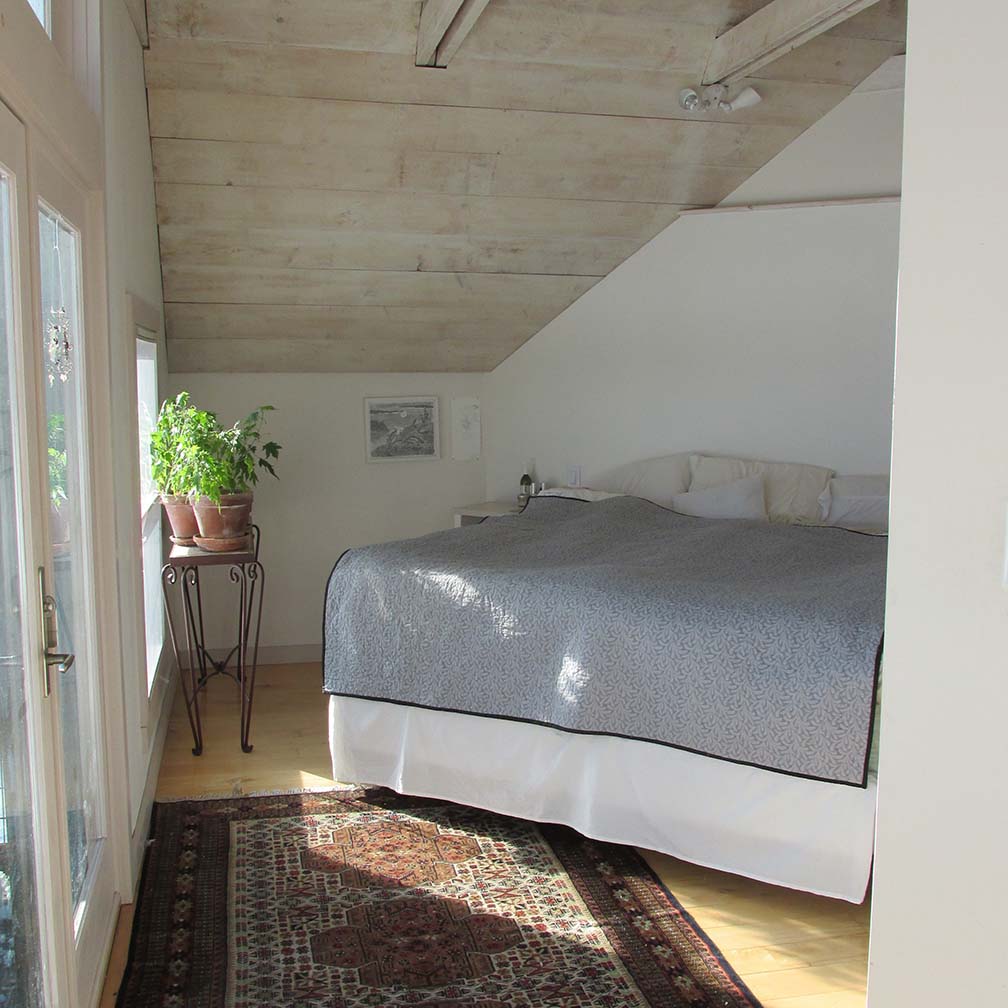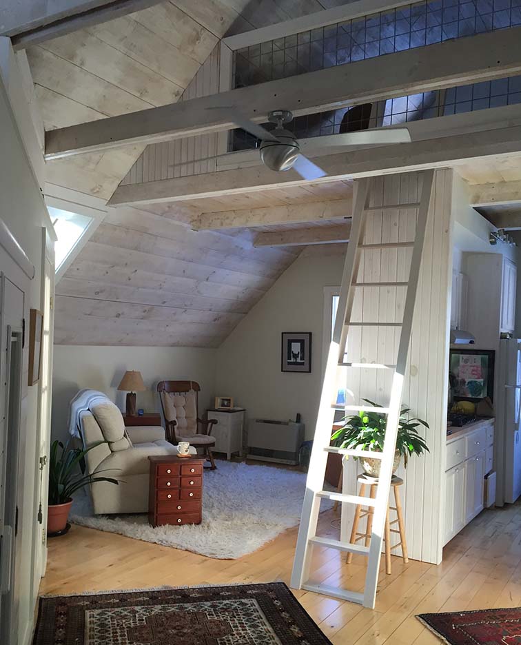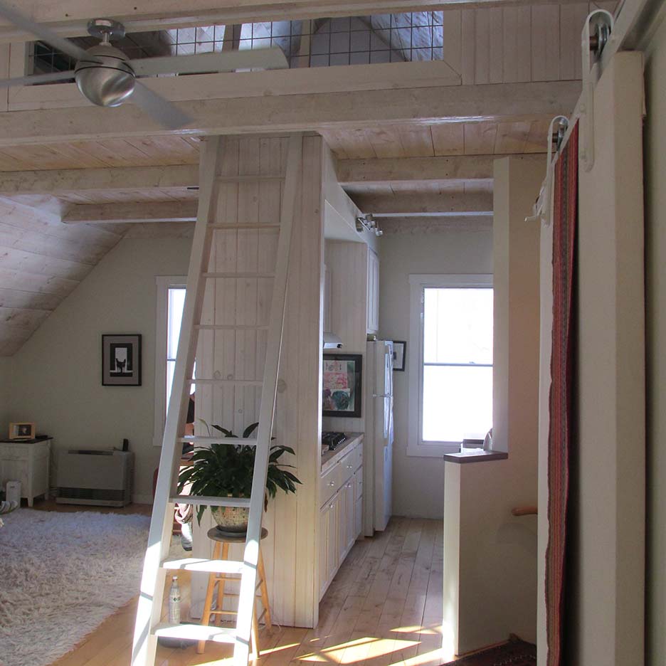A large open second floor of a barn was converted to a warm apartment and office for a couple operating a school for healing practices. Thoughtful space allocation created a private retreat to relax and recharge in order to conduct the teaching sessions to their fullest capacity.
