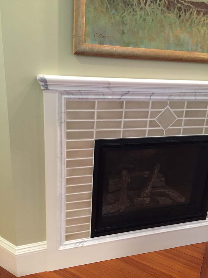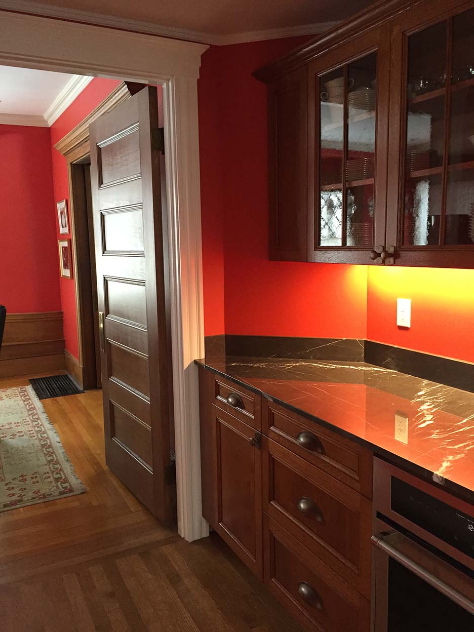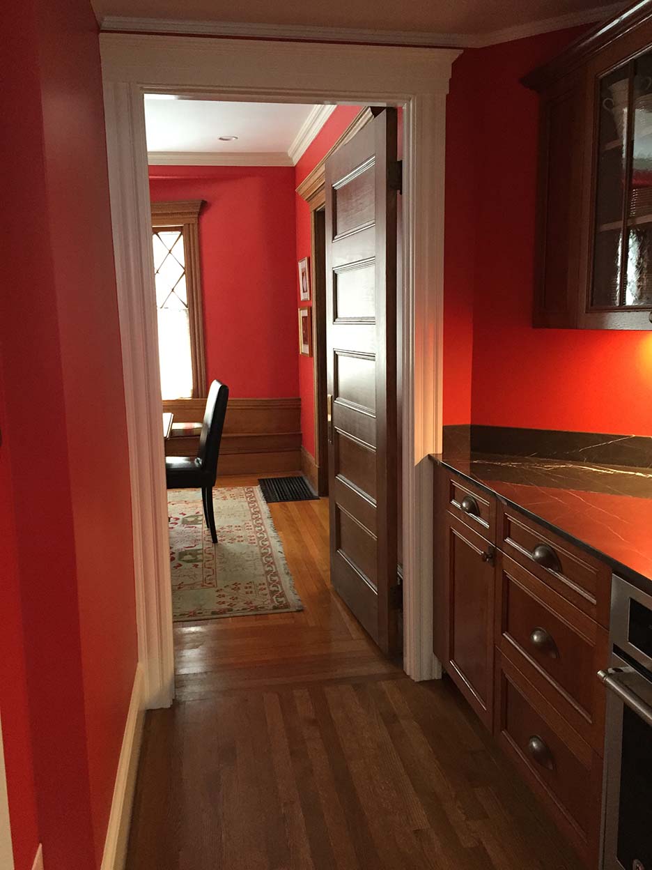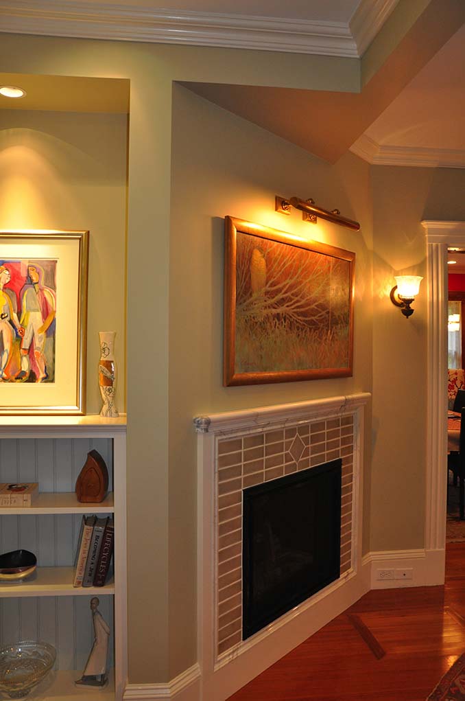 The living room of this 1920’s home had an alcove fireplace which was never used and made it difficult to lay out furniture. Its removal allowed for a rear hall connection between the kitchen and dining room and the installation of a Butlers Pantry. The creation of a focal point in the living room with a new gas fireplace angled to reflect the opposite generous bay window allowed a seating arrangement conducive to good conversation and large gatherings.